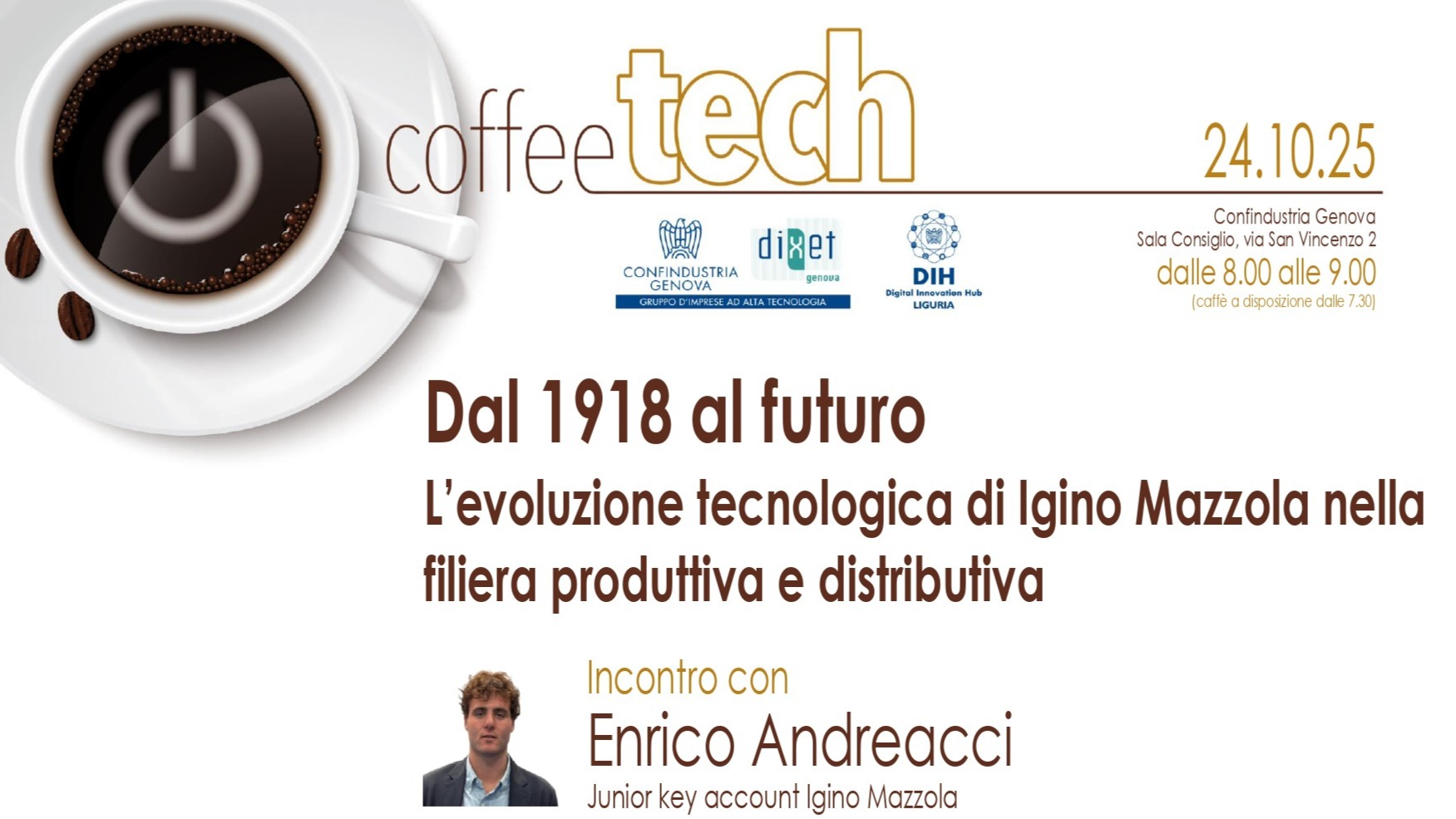 Il Coffeetech consiste in un appuntamento settimanale di libero accesso organizzato da Digital Innovation Hub Liguria, Confindustria Genova e Dixet ogni venerdì mattina dalle ore 8.00 alle ore 9.00 dedicato a un tema di natura tecnologica presso la sede di Confindustria Genova in Via San Vincenzo 2 – Sala Consiglio (6° piano). Caffè e focaccia a disposizione dei partecipanti dalle ore 7.30.