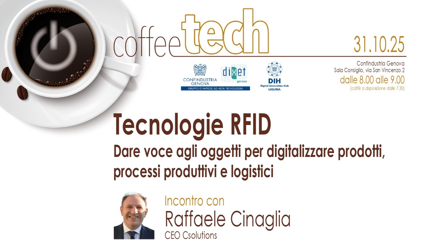 Il Coffeetech consiste in un appuntamento settimanale di libero accesso organizzato da Digital Innovation Hub Liguria, Confindustria Genova e Dixet ogni venerdì mattina dalle ore 8.00 alle ore 9.00 dedicato a un tema di natura tecnologica presso la sede di Confindustria Genova in Via San Vincenzo 2 – Sala Consiglio (6° piano). Caffè e focaccia a disposizione dei partecipanti dalle ore 7.30.