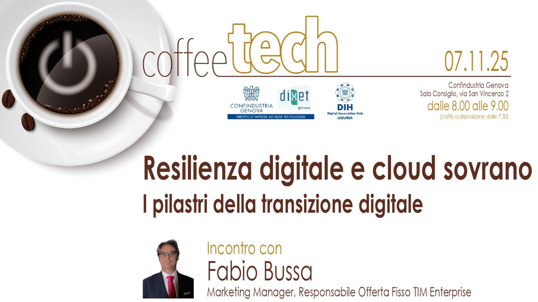 Il Coffeetech consiste in un appuntamento settimanale di libero accesso organizzato da Digital Innovation Hub Liguria, Confindustria Genova e Dixet ogni venerdì mattina dalle ore 8.00 alle ore 9.00 dedicato a un tema di natura tecnologica presso la sede di Confindustria Genova in Via San Vincenzo 2 – Sala Consiglio (6° piano). Caffè e focaccia a disposizione dei partecipanti dalle ore 7.30.