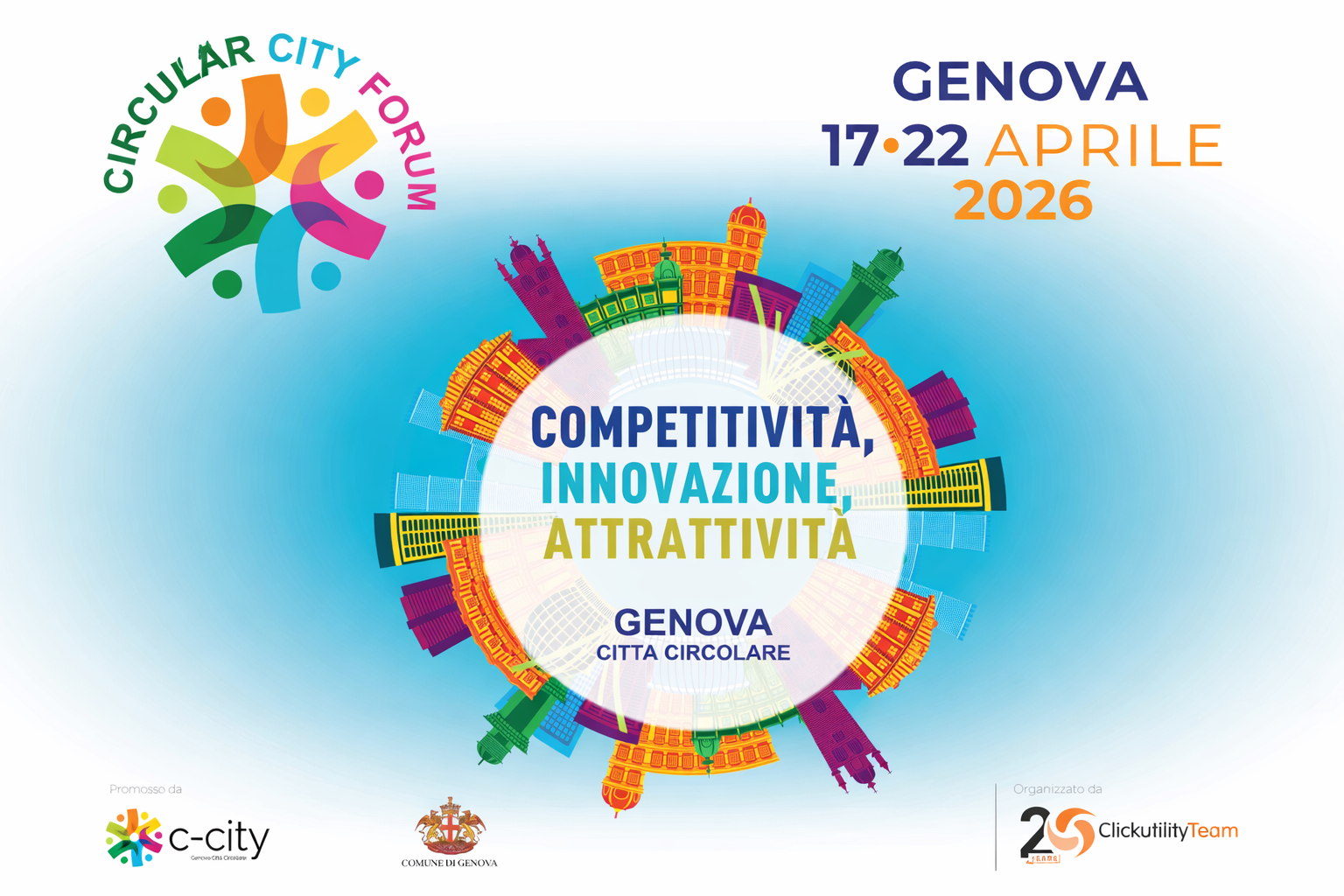 Il Circular City Forum coinvolge istituzioni, imprese, mondo della ricerca e comunità educanti con l’obiettivo di trasformare la sostenibilità in un’infrastruttura concreta di sviluppo urbano. Promosso dal Comune di Genova in collaborazione con la Camera di Commercio e con il supporto organizzativo di Clickutility Team.