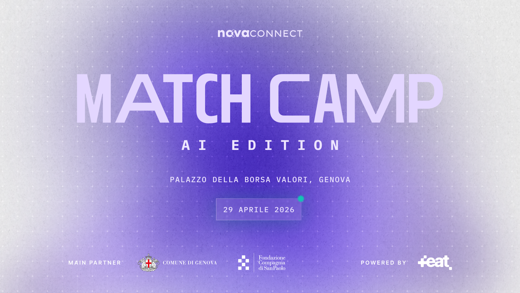 Match Camp – AI Edition è un’iniziativa di Nova Connect, realizzata da Feat. Ventures con i main partner Comune di Genova e Fondazione Compagnia di San Paolo.